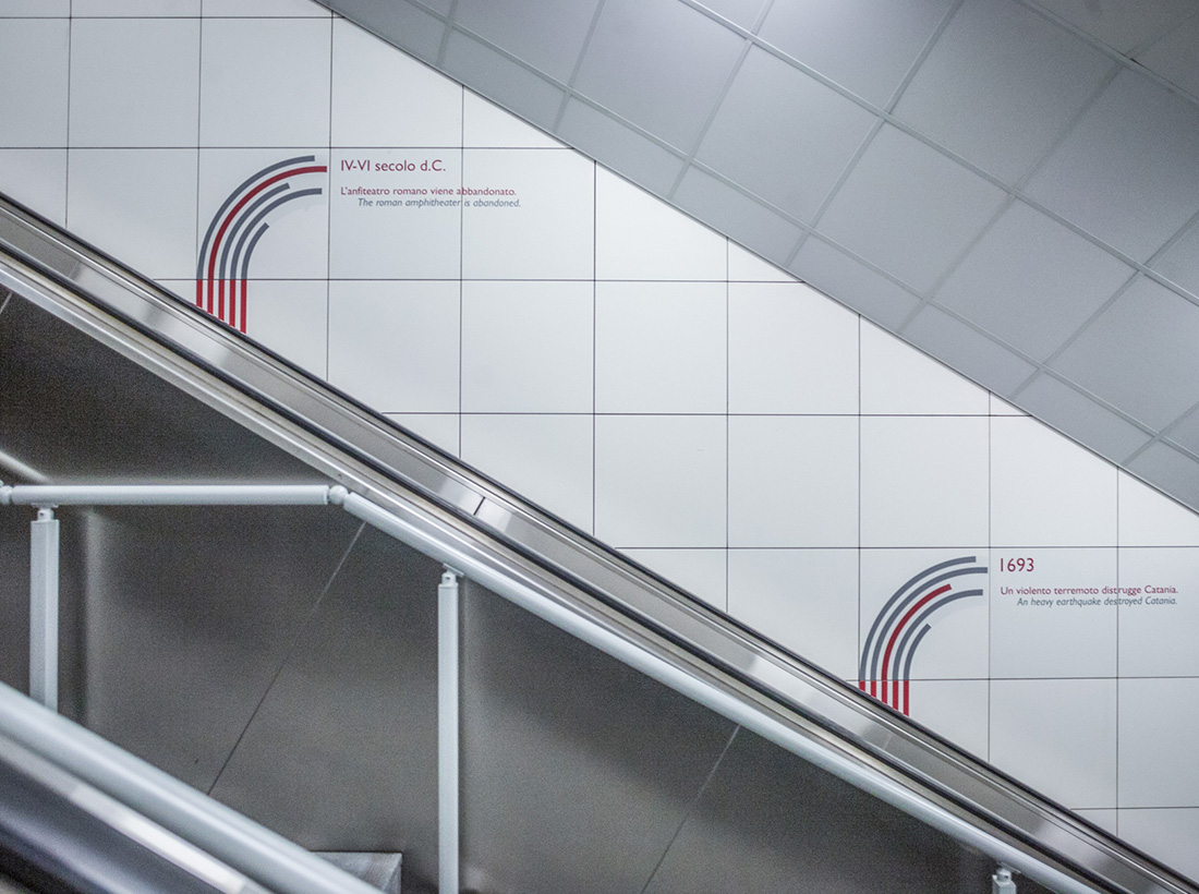Disegni ricostruttivi 3d ed un glossario illustrano la geometria dell’Anfiteatro Romano della vicina piazza Stesicoro – che è il soggetto principale di questa stazione – mentre una timeline accompagna l’utilizzo delle scale mobili in un viaggio attraverso le principali tappe storiche che hanno interessato questa parte della città e l’anfiteatro, dalla sua costruzione all’abbandono e alla sua riscoperta.